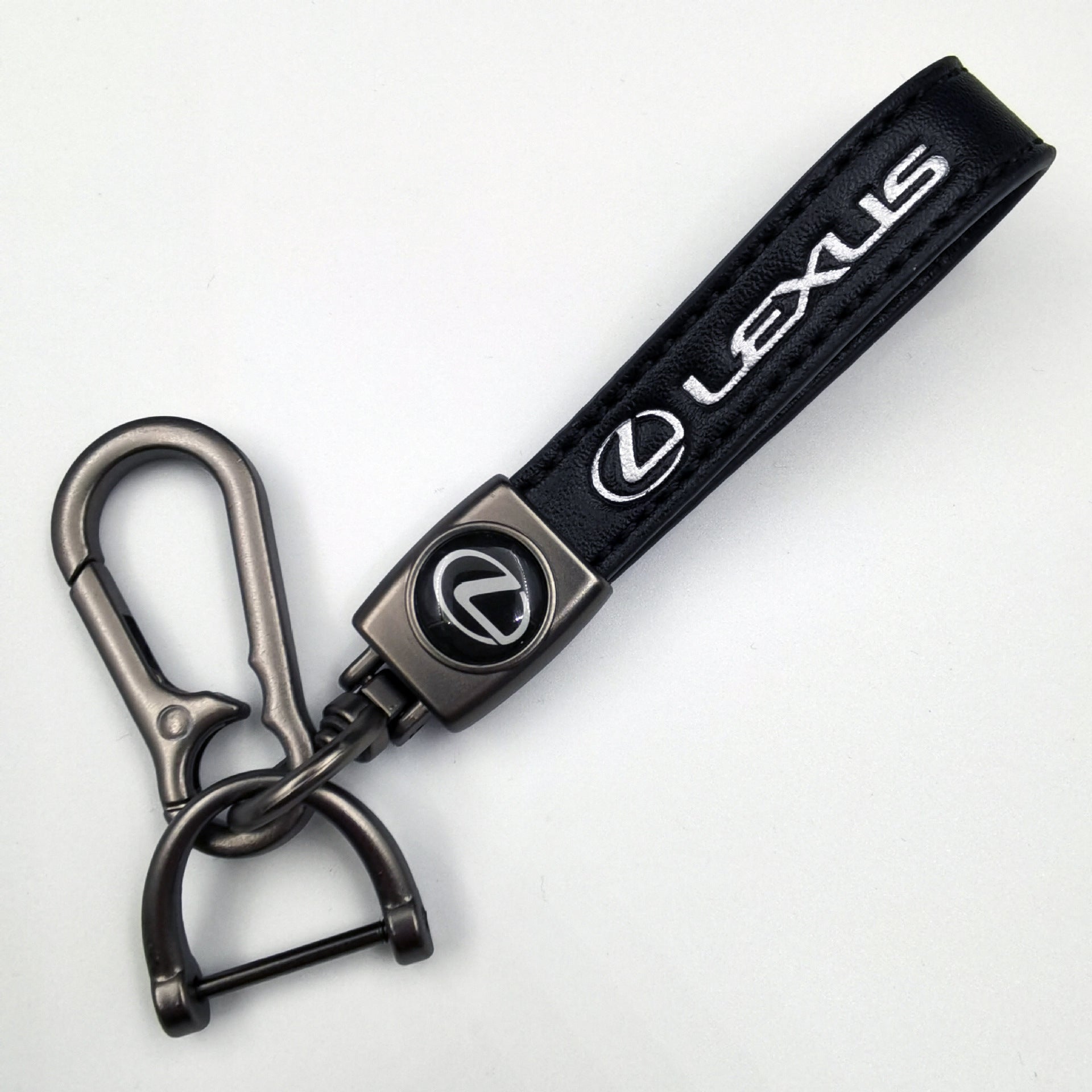 This polished keychain features smooth black leather paired with a sleek, distinct emblem design. Its sturdy metal carabiner keeps keys or bags securely fastened, blending timeless style with daily functionality. A refined, high-quality accessory that adds understated sophistication to your everyday carry.